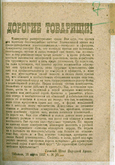 «За последнее время на почве хлебных разверсток и других повинностей среди крестьян по Тюменской губернии в высшей степени обострилось положение к действиям Советской власти, выразившись в некоторых случаях вспышками восстаний. Начальники же уездмилиций об этом умалчивают и неставят в известность Губмилицию, несмотря на то, что каждого начальника долг и обязанность осведомить о перечисленном немедленно Губмилицию.