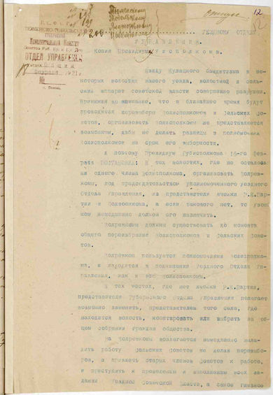4) Приняв целый ряд мер для установления необходимых условий для работы по проведению продработы и трудповинности, а ровно и водворение революцинного порядка как-то: образованный волостной и сельские ревкомы и волость объявлена на осадном положении. Происходит ловля дезертиров и изъятие оружия, снаряжения и контрреволюционных элементов, причастных к выступлению…»